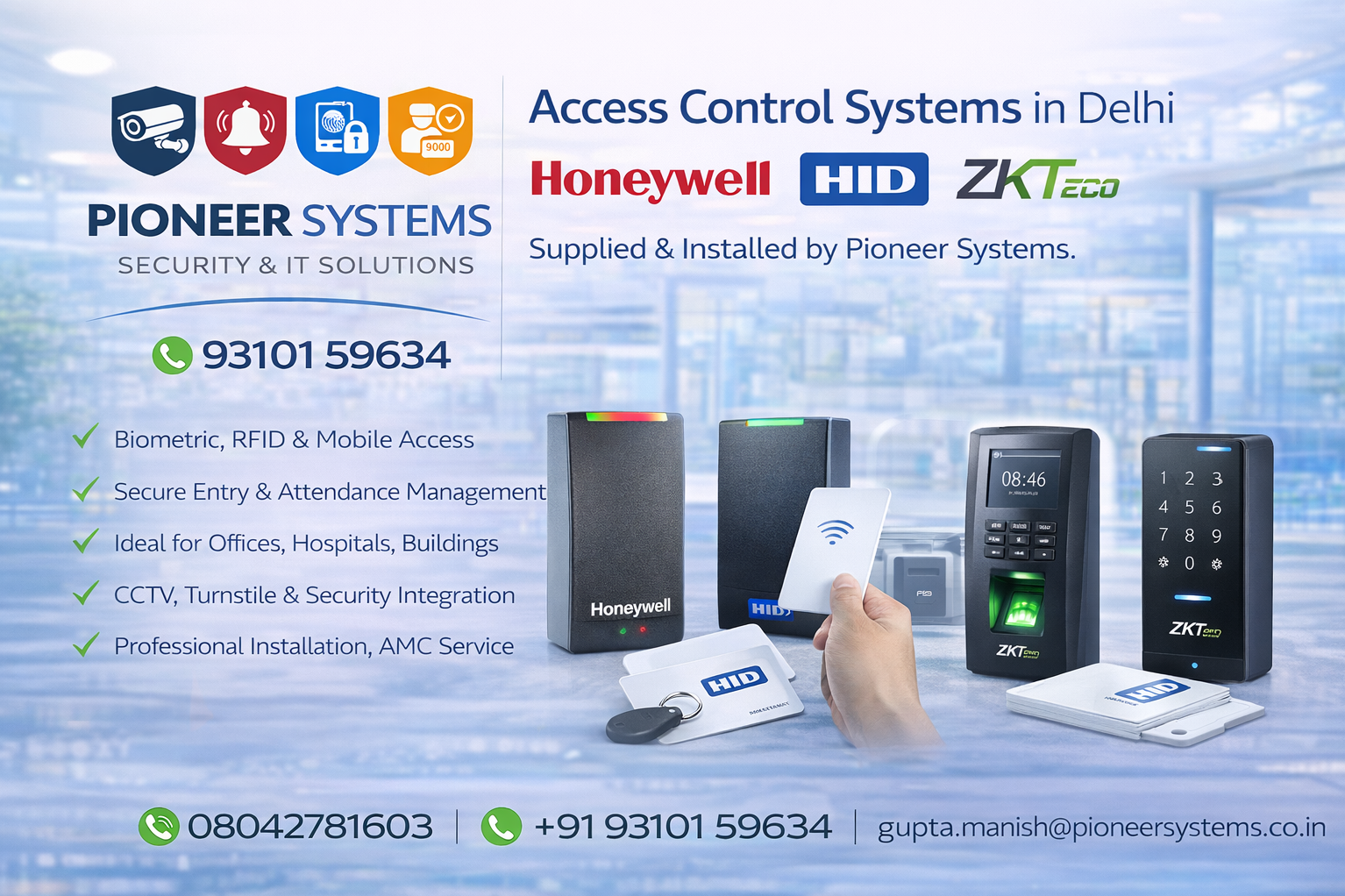 Secure your workplace, campus and commercial premises with advanced Access Control Systems by Honeywell, HID and ZKT, supplied and professionally installed by Pioneer Systems – Delhi’s trusted Security & IT Solutions company. Upgrade your security with smart biometric, RFID card and mobile-based access control solutions that help you control entry, track attendance and protect restricted areas with complete reliability. Access Control System Supplier in Delhi, Honeywell Access Control Delhi, HID Access Control Dealer Delhi, ZKT Biometric System Delhi, RFID Access Control System Delhi, Biometric Attendance System Delhi, Office Security Solutions Delhi, Access Control Installation Company in Delhi NCR.