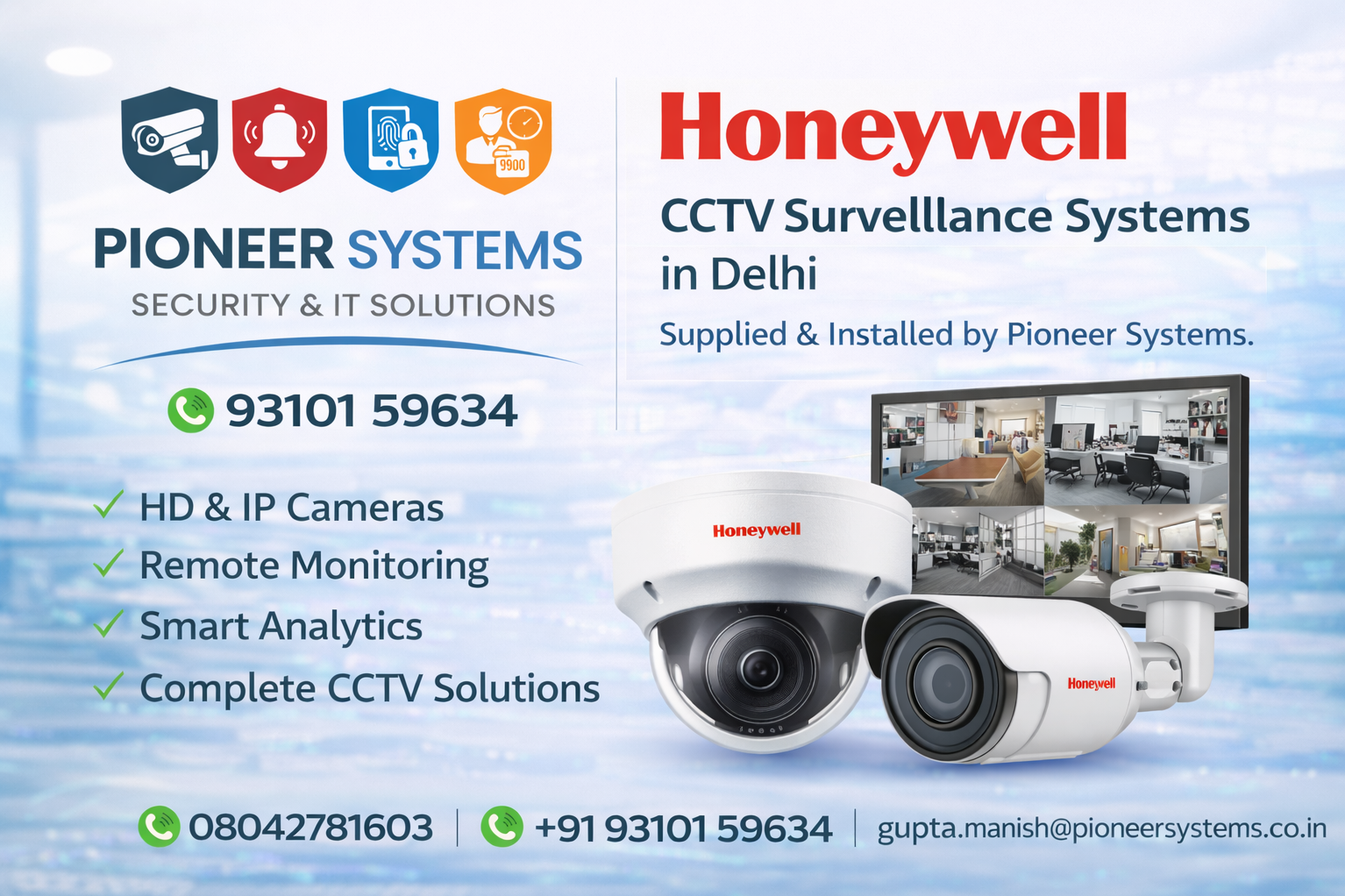 Pioneer Systems is a leading Honeywell CCTV Surveillance System supplier and system integrator in Delhi, delivering advanced video security solutions for commercial, industrial and residential projects. We provide complete end-to-end solutions for Honeywell IP cameras, HD CCTV cameras, NVR/DVR systems and remote monitoring platforms to help organizations protect people, assets and critical infrastructure. Our Honeywell CCTV solutions are ideal for offices, corporate buildings, factories, warehouses, hospitals, schools, retail stores and residential societies across Delhi NCR. Honeywell CCTV systems are designed to deliver high image clarity, intelligent video analytics, reliable recording and secure remote access, making them one of the most trusted surveillance brands in the world. With professional design and installation by Pioneer Systems, you get maximum camera coverage, optimized network performance and long-term system reliability. Honeywell CCTV Surveillance Systems Delhi, Honeywell CCTV Supplier in Delhi, Honeywell CCTV Installer Delhi NCR, CCTV Camera Installation in Delhi, IP CCTV System Supplier Delhi, Office CCTV System Delhi, Warehouse CCTV Installation Delhi, Commercial CCTV Solutions Delhi, Best CCTV Company in Nehru Place, Pioneer Systems Honeywell CCTV