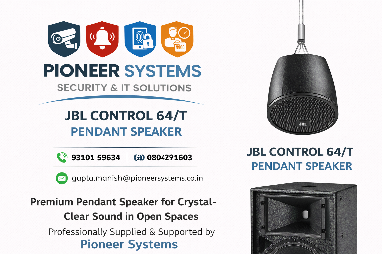 JBL Control 64P/T Pendant Loudspeaker is a compact, full-range audio solution engineered for modern commercial environments with open architecture ceilings. Featuring a 100 mm (4-inch) high-performance driver, wide 120° sound coverage, and 70V/100V & 8-ohm compatibility, it ensures clear, balanced audio across large areas with minimal speakers required. Supplied by Pioneer Systems, a trusted name in professional audio, security, and IT solutions, this pendant speaker combines exceptional JBL sound quality, easy installation, and long-term reliability. JBL Control 64P/T speaker, pendant speaker for open ceiling, commercial pendant speaker India, JBL professional speakers Delhi, ceiling pendant speaker system, buy JBL pendant speaker India, Pioneer Systems audio solutions