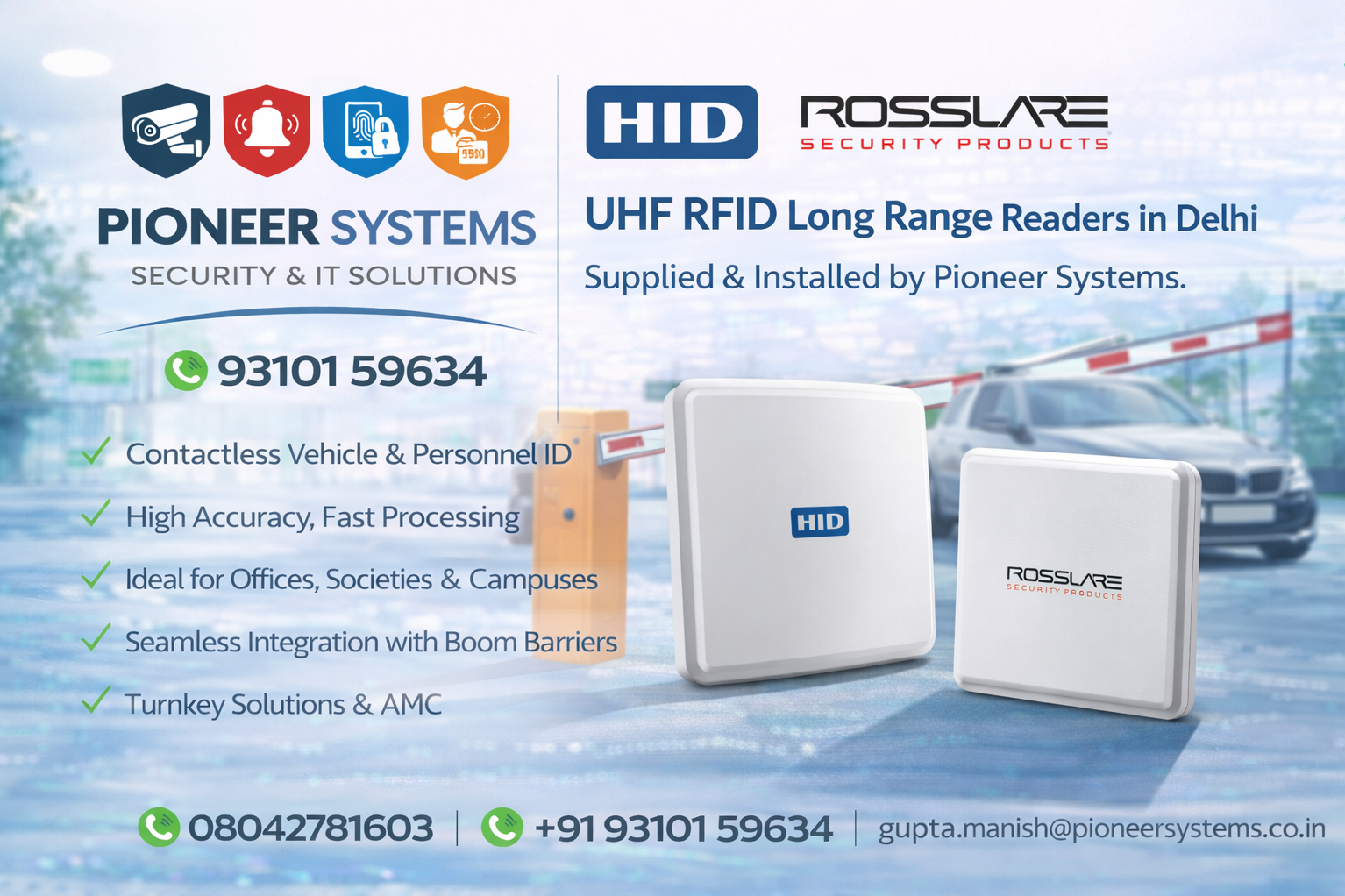 ioneer Systems is a leading UHF RFID Long Range Reader supplier and system integrator in Delhi, offering world-class solutions from globally trusted brands HID and Rosslare. Our UHF RFID systems are designed to provide high-speed, long-distance identification and access control for vehicles and people with maximum reliability and security. UHF RFID Long Range Readers in Delhi, HID UHF RFID Reader supplier in Delhi, Rosslare UHF RFID system Delhi, Long range RFID for parking in Delhi, UHF RFID access control system Delhi, Vehicle RFID reader supplier in Delhi, RFID boom barrier integration Delhi. Looking for a reliable UHF RFID Long Range Reader supplier in Delhi? Contact Pioneer Systems today for a site survey and a customized HID or Rosslare RFID solution for your project.